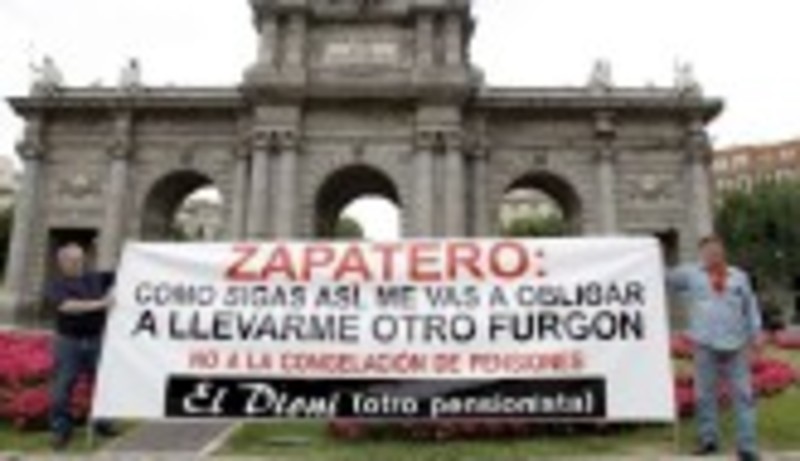 El Dioni, que ya se fundió en Brasil el botín de su atraco, se ha plantado en la madrileña Puerta de Alcalá con una pancarta en la que se leía "Zapatero, como sigas así me vas a obligar a llevarme otro furgón" y que estaba firmada por "El Dioni (otro pensionista)".