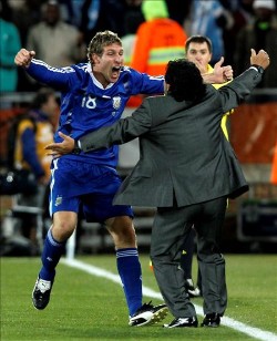 Verón primero y Messi después, pudieron abrir el marcador al filo del descanso, pero hubo que esperar a la recta final para derribar la muralla helena. Fue un héroe poco habitual, Demichelis, quien hiciera los honores al remachar un disparo que previamente le había taponado Milito. El gol era la única evidencia que le faltaba a la superioridad argentina.