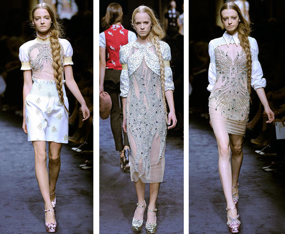Miu Miu hemos encontrado, entre otros, estos tres modelos. En corto o largo, con cuello camisa y transparencias o en blusa y con falda. Lo que importa son los bordados de cuentas de cristal y pedrería que unidos al tono maquillaje los hace sofisticados a la par que naif. El contraste entre esos dos términos es lo que los hace realmente atractivos. Para completar esta singular mezcla sus ya famosas plataformas para este verano con estampados de los más variado.