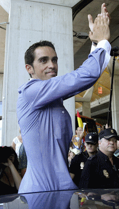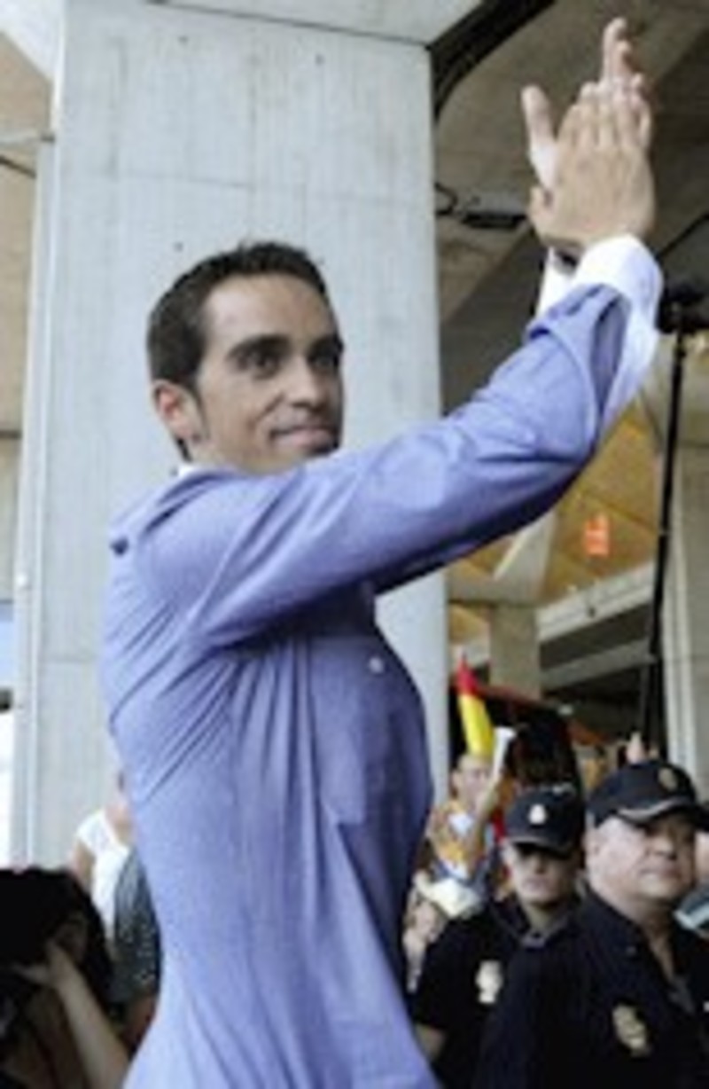 Contador tuvo un multitudinario recibimiento en el aeropuerto de Barajas, donde recibió las muestras de cariño de sus 'vecinos' de Pinto y aseguró que para el próximo año