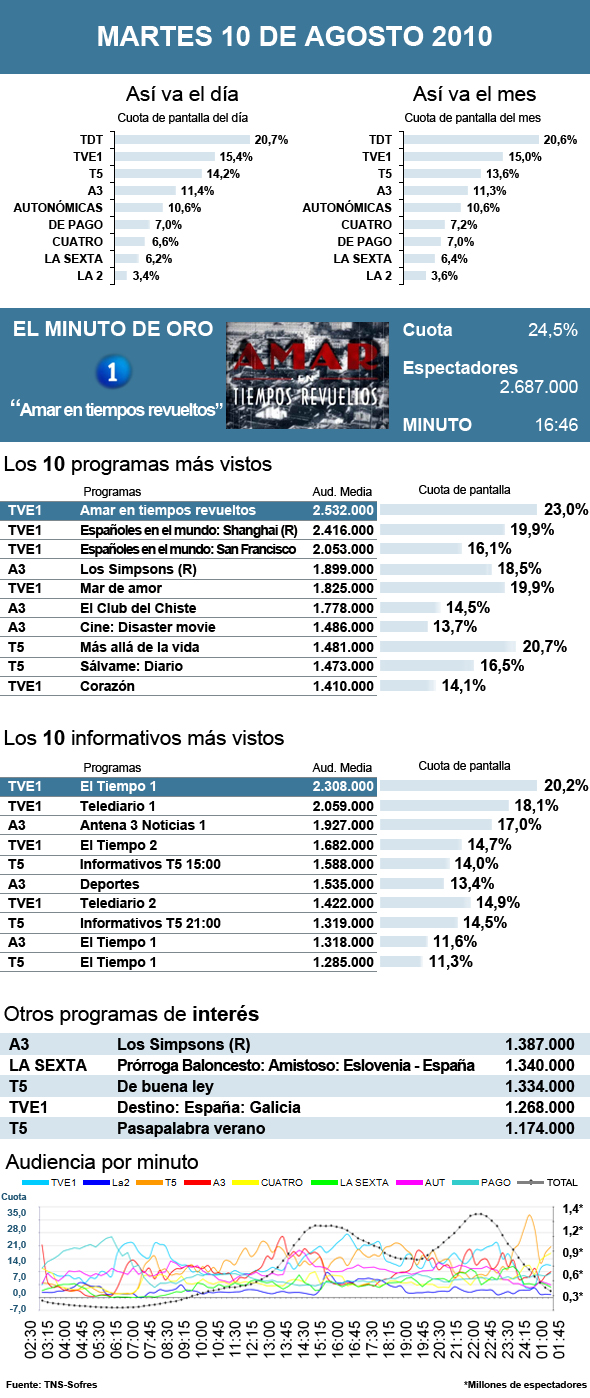 Amar en tiempos revueltos volvió a reinar en la sobremesa. Tanto que llegó a alcanzar este miércoles el minuto de oro con 2.687.000 de espectadores. La noche estuvo más reñida. La 1 volvió a acaparar el mando de la tele gracias a la emisión de dos entregas de Españoles por el mundo, gracias a las que logró una media de 2.053.000 espectadores con San Francisco como destino y 2.416.000 en el caso de Shanghai. Le siguió de cerca Antena 3 y su Club del chiste VIP. El cine de Telecinco, La señal, no tuvo una destacada acogida, pero sí el estreno de Más allá de la vida con Jorge Cadaval, Ramona Maneiro, Antonio Gala y Carmen Martínez Bordiú como protagonistas de este polémico espacio en el que, supuestamente, se entra en contacto con fallecidos. Logró un 20, 7% de cuota de pantalla y 1.481.000 espectadores de media.