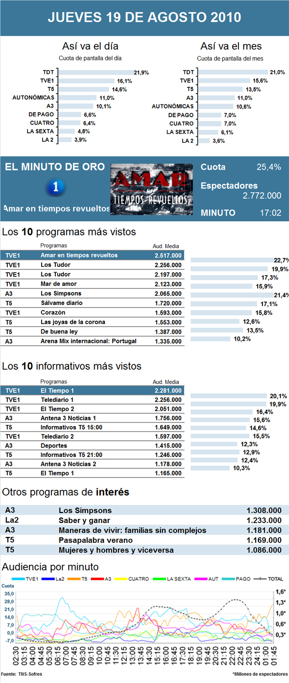 La1 sigue liderando y ya no sólo es la cadena más vista del día y del mes, sino que, además, consiguió colar cuatro de sus programas en los primeros puestos del ránking de audiencias de este jueves 19 de agosto. Amar en tiempos revueltos volvió a ser líder indiscutible del día y consiguió 2,5 millones de espectadores y el 21,7 por ciento del share. La serie de la sobremesa se hizo también con el minuto de oro, con 2,7 millones de telespectadores y el 25,4 por ciento del share. A este programa le siguió en el segundo y tercer puesto otra serie de época, Los Tudor, que se hizo con el 19,9 y el 17,3 por ciento del share y que fue seguida por 2,2 y 2,1 millones de telespectadores. Mar de amor, de TVE, y Los Simpsons, Antena 3, también superaron los dos millones de espectadores.