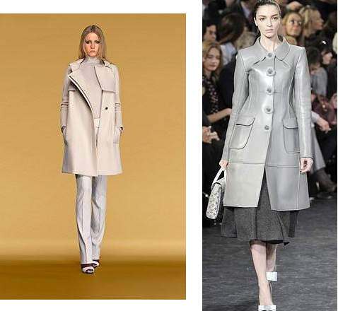 LOUIS VUITTON: un abrigo en piel gris, de corte clásico, con una maxi falda de niña bien que no pensábamos volver a ver tan pronto, pero que nos encanta.
