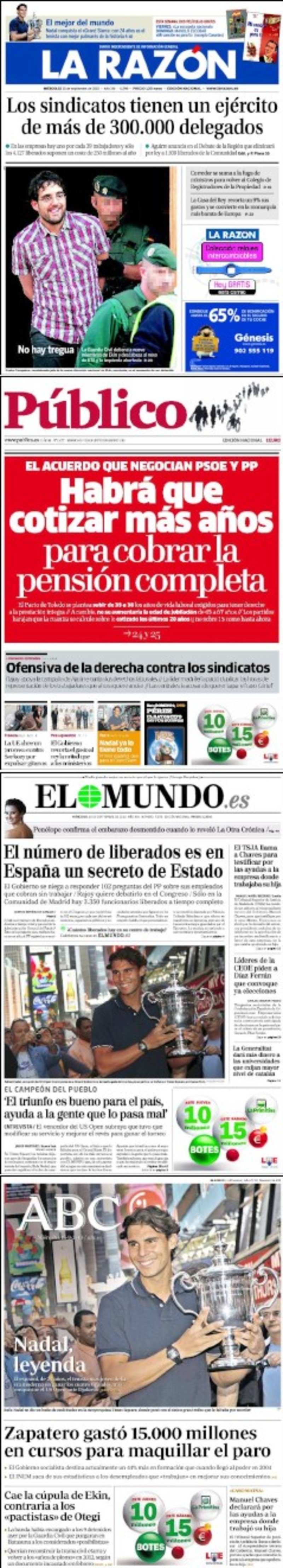 El tenista español Rafa Nadal, con foto en la mayoría de diarios, y los liberados sindicales copan las portadas de este miércoles en el que a la pregunta que deja El Mundo en el aire con el titular “El número de liberados es en España un secreto de Estado” contesta La Razón con el suyo: “Los sindicatos tienen un ejército de más de 300.000 delegados”. Público lo ve como “Ofensiva de la derecha contra los sindicatos”. El primer ABC de la era Bieito Rubido lleva a cinco columnas “Zapatero gastó 15.000 millones en cursos para maquillar el paro” mientras El País, en clave internacional, abre con que “Bruselas amenaza con sancionar a Francia por la expulsión de los gitanos”.