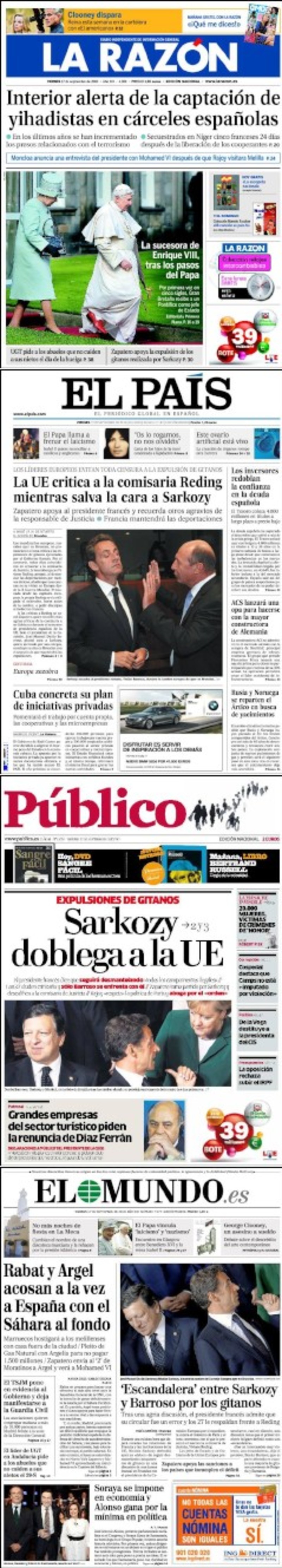 El País, por su parte, titula también a cinco: “La UE critica a la comisaria Reding mientras salva la cara a Sarkozy” y en su editorial “Europa zozobra” critica el seguidismo de los 27 que optaron por criticar a la comisaria de Justicia y no al presidente francés por sus deportaciones de gitanos. En la información, el diario de Prisa dice que “zapatero no quiere indisponerse con el presidente francés… aunque ello le obligue a mirar para otro lado ante las expulsiones de rumanos y búlgaros de etnia gitana”. La imagen de portada es para un altivo Sarkozy mientras habla con el presidente rumano. También destaca en portada que “Cuba concreta su plan de iniciativas privadas” y que “El Papa llama a frenar el laicismo”.