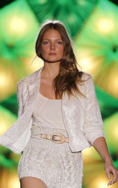 En su más puro estilo, Ágatha Ruiz de la Prada hizo del color la razón de ser de una colección en la que ha buscado la comodidad, huyendo de todo lo superfluo. Sus propuestas siguen los preceptos que siempre ha defendido: color, juegos de volúmenes y materiales y comodidad. Organzas, sedas, lino combinados con lentejuelas, bolas de colores cosidas a los vestidos y algodón que reinterpretan los iconos de la casa, todos ellos presentes en un desfile del día de la marmota.