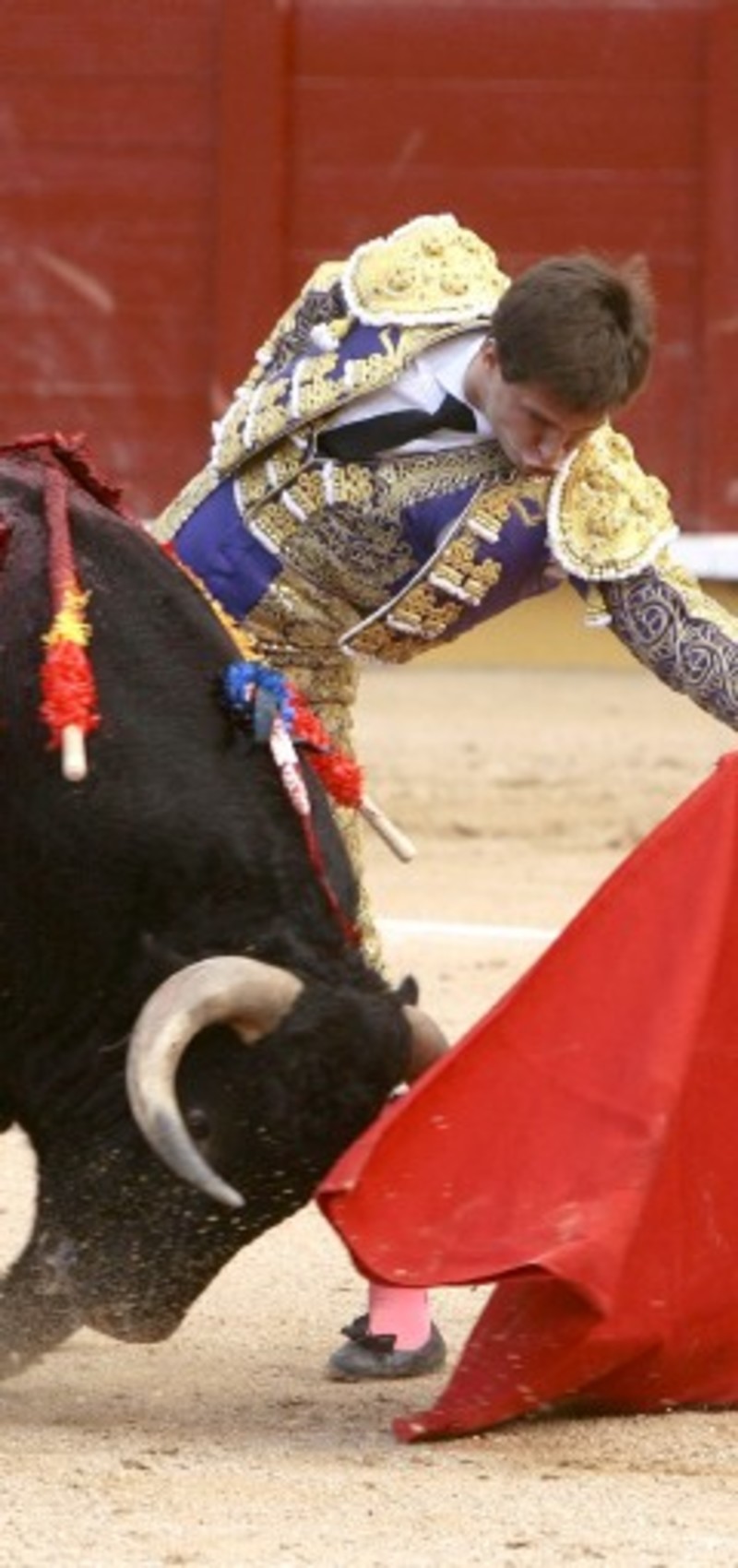 Midió Julián al primero en el capote sacrificando gracia por eficacia. Pero perdió a continuación las manos, enterró pitones y hubo hasta un comentario (serio, nada irónico) de un señor que aseguraba que en el pueblo una tal Joaquina “tenía un cordero que topaba más que este. Le hacías así…” El Juli ni lo mataba ni lo descabellaba. Tenía muy mala cara.