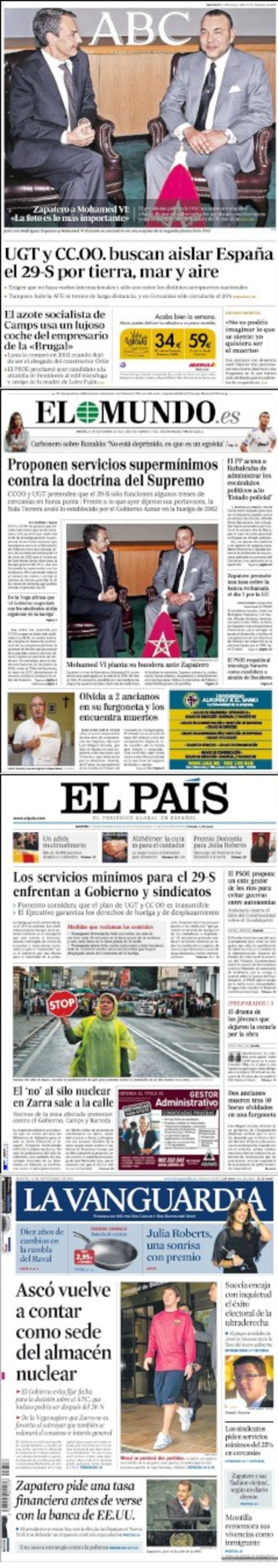 Zapatero sólo buscaba la foto con Mohamed VI en Nueva York y lo consiguió. El presidente del Gobierno español y el rey de Marruecos copan las fotos de las principales portadas de este martes. El pie de foto de ABC lo dice todo: “La foto es lo más importante”. Sin embargo, los titulares de primera en todos los periódicos son para los servicios mínimos que los sindicatos quieren imponer en los servicios de transporte de cara a la huelga del próximo día 29.