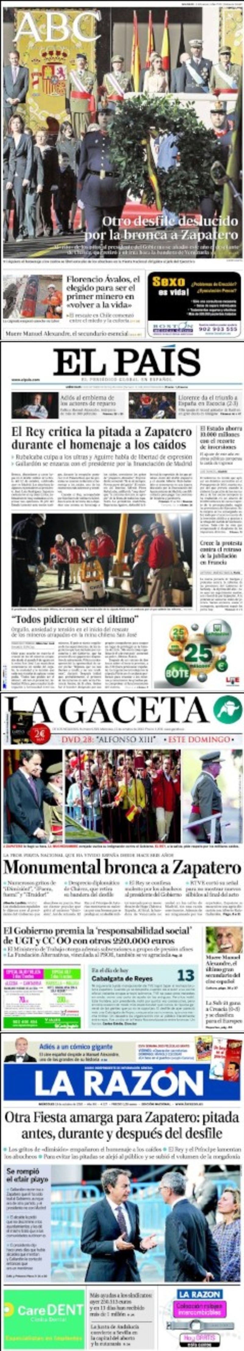 La Gaceta destaca en gran titular “Monumental bronca a Zapatero”. La imagen de portada son tres fotos en las que se puede ver al presidente, serio, el Rey don Juan Carlos y un grupo de personas abucheando a Zapatero. El diario de Intereconomía resalta el “desprecio diplomático de Chávez, que retira su bandera del desfile”, que “el Rey se confiesa molesto por los abucheos” y que “RTVE cortó su señal para no mostrar nuevos silbidos al final del acto”. También hay sitio para “el Gobierno premia la responsabilidad social de UGT y CCOO con otros 220.000 euros” y para Manuel Alexandre, “el último gran secundario del cine español”.