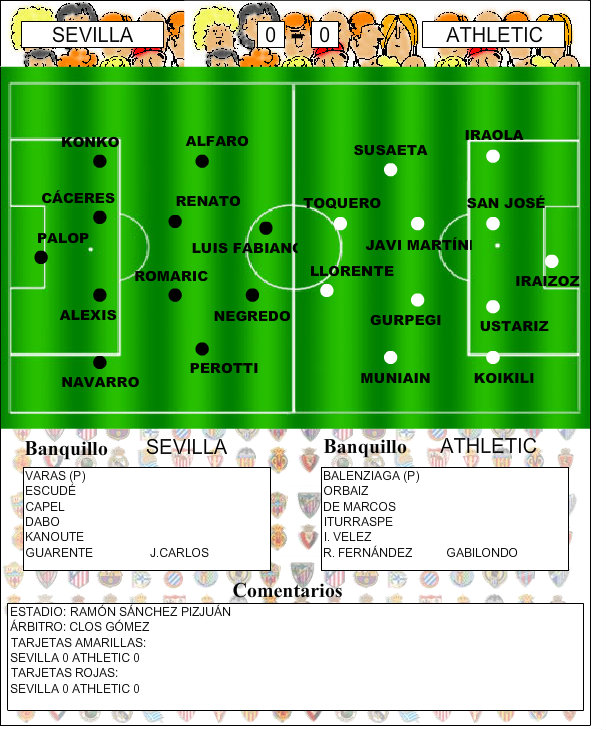Era una partido en el que ambos equipos buscaban una importante victoria para confirmar sus aspiraciones de luchar por puestos europeos y pronto se vio que el conjunto vizcaíno no iba a especular con el resultado, pues su técnico, Joaquín Caparrós, dispuso de un 'once' ofensivo con Gaizka Toquero y Llorente incrustados entre los centrales sevillistas y con Markel Susaeta e Iker Muniain con mucha profundidad por los extremos.