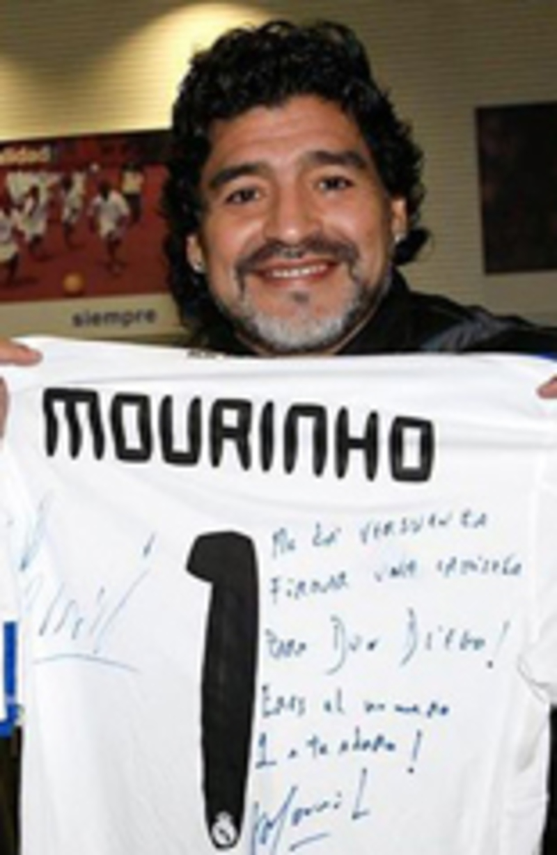 El entrenador del Real Madrid, José Mourinho, ha regalado una camiseta del conjunto blanco al ex seleccionador de Argentina, Diego Armando Maradona en su visita a la Ciudad del Real Madrid en Valdebebas. En ella se puede leer: "¡Me da vergüenza firmar una camiseta a Don Diego!. Eres el número 1. Te adoro".