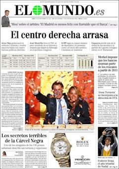 El Mundo deja sitio en su portada a las torturas descritas por uno de los abogados de los 130 presos saharauis, para la imposición de Merkel de que los bancos asuman su parte de los rescates a partir de 2013, para el nuevo “director” del “aparato político” de ETA, José Ternera, y para la derrota de Rafa Nadal. Pero su gran información de portada es, por supuesto, que “El centro derecha arrasa” en las elecciones catalanas celebradas este domingo. El periódico que dirige Pedro J. Ramírez dice que Artur Mas gobernará en solitario, que José Montilla lleva al PSC al peor resultado de su historia y anuncia que dejará su liderazgo en el próximo congreso, que ERC pierde más de la mitas de sus escaños y que el PP logra su mayor número de diputados y lo presenta como “el anuncio del cambio”.