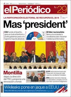 El Periódico de Catalunya titula con un “Mas president” y destaca que la participación electoral se ha recuperado este 28-N con respecto a 2006. También destaca la salida del PSC de Montilla y su petición de “una renovación a fondo”. El Periódico también habla del PP, del que dice que “será la tercera fuerza del Parlament, en el que se cuela Laporta y se afianza Ciutadans”.