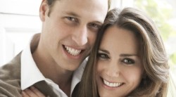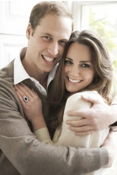 los dos sonriendo.Guillermo viste traje azul, camisa blanca y corbata morada y Kate lleva un sencillo y elegante vestido blanco y, en su mano izquierda, el anillo de compromiso que perteneció a la madre del novio, Lady Di, fallecida en 1997 en un accidente de tráfico en París. Esta fotografía, en plano americano (tres cuartos del cuerpo), está tomada en la Cámara del Consejo del Palacio de Saint James (Londres), construido por Enrique VIII en el siglo XVI, y se pueden ver una alfombra granate y cuadros de los antepasados de Guillermo en el fondo.