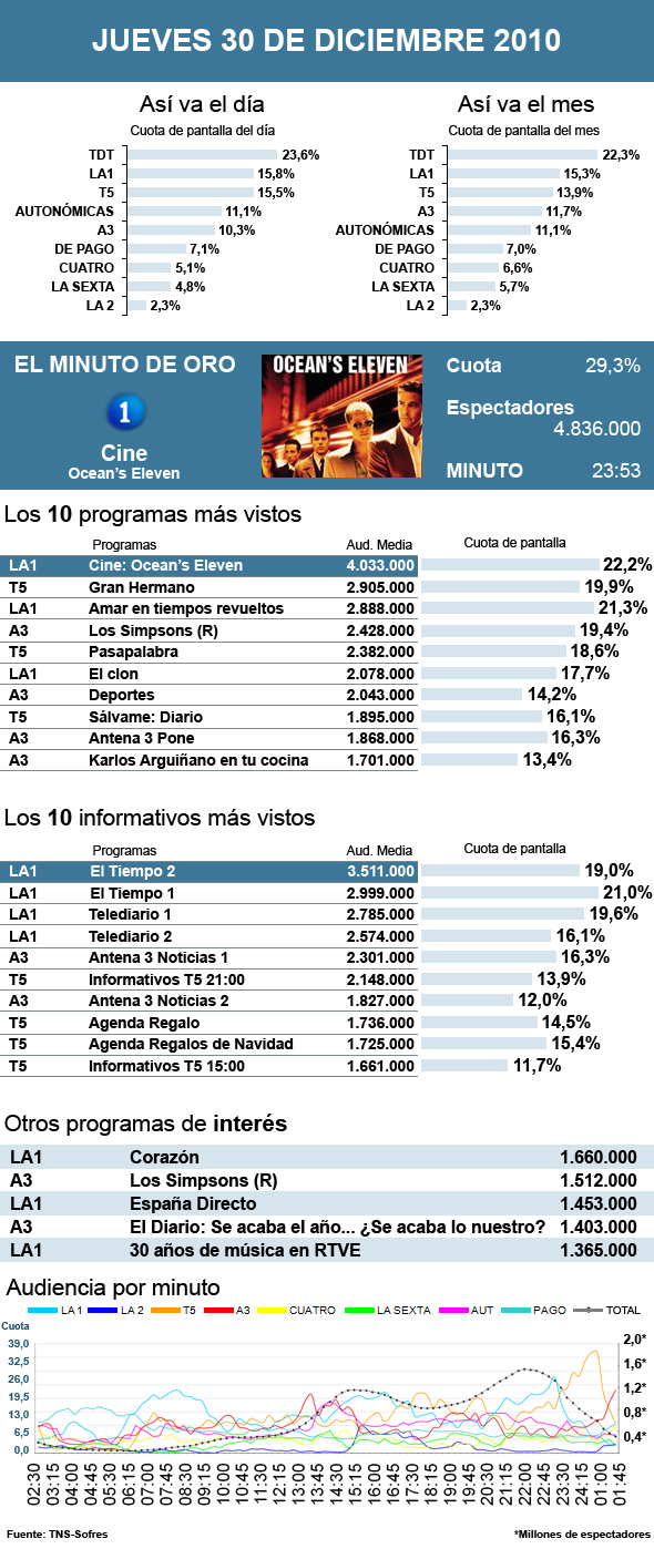 Este jueves, La 1 volvió a ser la preferida de los espectadores para entretenerse durante la sobremesa y la noche. "Amar en tiempos revueltos" repitió como lo más visto de la tarde con una media de 2.880.000 espectadores. Ya en el horario nocturno, el cine de la cadena pública, "Ocean´s Eleven" se coronó como el espacio más seguido de la noche con una media de 4.033.000 espectadores y una cuota de pantalla del 22,2 por ciento. Por detrás se quedó "Gran Hermano" de Telecinco con una media de 2.905.000 espectadores y eso que se benefició de la salida de Chari y su reencuentro con Rubén. Tanto que logró el mejor dato desde su estreno.