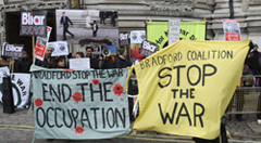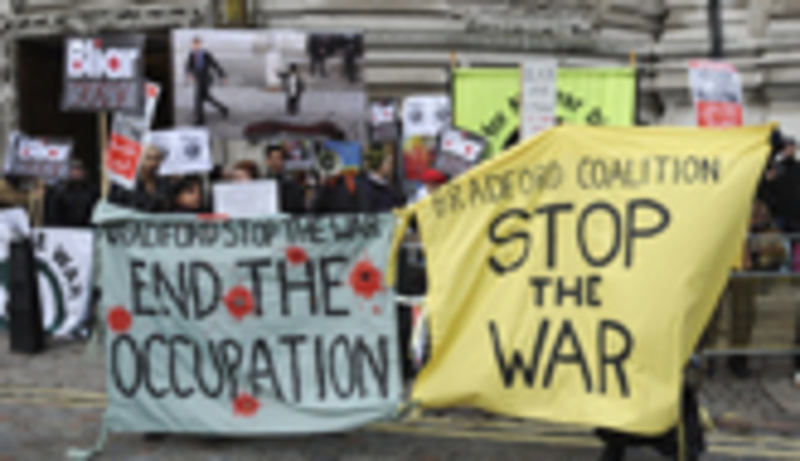 Coincidiendo con su comparecencia en el Queen Elizabeth Hall, frente al Parlamento británico, un grupo de actores, parlamentarios, organizaciones contra la guerra y familiares de soldados británicos muertos se manifestaron en señal de protesta, y se quejaron de que el testigo hubiera llegado de madrugada para evitar su asedio.
