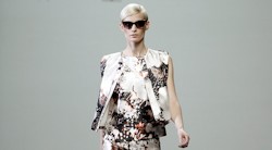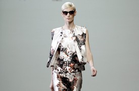 estampados sobre un nítido y brillante raso se han ido intercalando en la primera parte del desfile, a ritmo de una música muy marchosa. Además, los trajes de chaqueta en marrón chocolate han causado especial atención en el público, lo mismo que las minifaldas de corte recto con sensuales aberturas laterales.