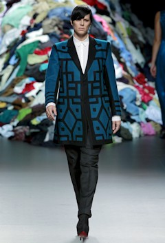 En este particular desfile también ha habido hueco para la línea masculina de la diseñadora, en la que los hombres se entremezclaban con las mujeres luciendo unas prendas que han seguido la misma línea que las de la parte femenina. Abrigos, jerseys y pantalones bicolores han contrastado con el que, sin duda, ha sido el diseño más arriesgado de Ana: faldas cortas y largas también para los hombres, llenas de plisados y en color negro.