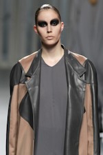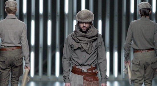 La primitiva simbiosis entre cazador y presa ha sido la idea central que la firma Etxeberría ha llevado hoy a la pasarela, con prendas exclusivamente masculinas en las que la piel está omnipresente.
