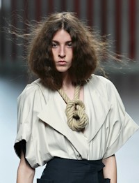 En las propuestas de día, se han visto líneas asimétricas y cortes vivos en abrigos, vestidos y bermudas trabajadas en lanas sin teñir en colores neutros. Para la noche, ha elegido materiales etéreos como la seda que jugaban con otros más gruesos como fieltro hasta tallar piezas que esculpían el cuerpo de la mujer con formas que evocan el mundo vegetal.