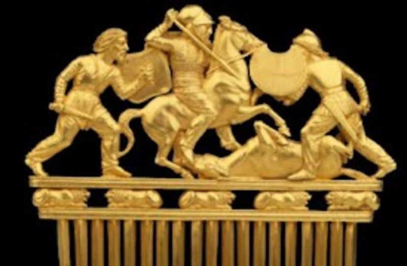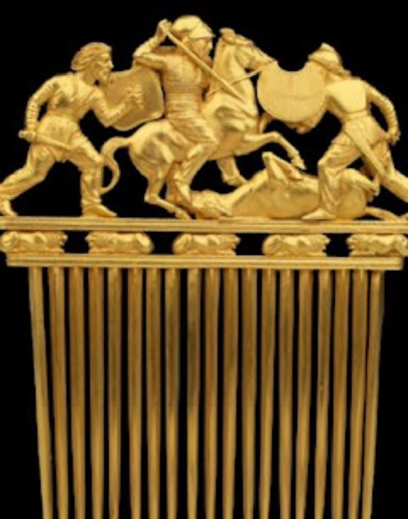 peine del túmulo de Solokha, de origen escita, ambos tallados en oro unos 500 años antes de Cristo. La exposición se estructura en tres salas y ocupa una superficie de 900 metros cuadrados.