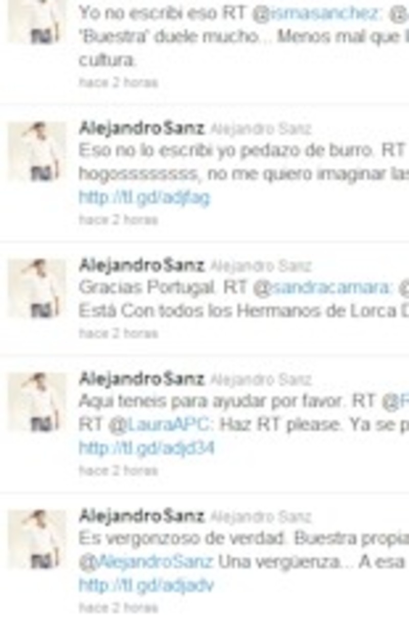 Alejandro Sanz utilizó su cuenta de Twitter para expresar su apoyo a los afectados y tuitear toda la información que consideraba útil para sus seguidores. Algo que muchos le agradecieron y otros le reprocharon. "@AlejandroSanz Hay miles de personas ayudando humildemente q están arrimando el hombro siempre... Y tú vas de superman de cara a los medios", le reprochaba una de sus seguidoras, "siempre aprovechando cualquier situación para hacerte notar. Nos cansas", decía otro.