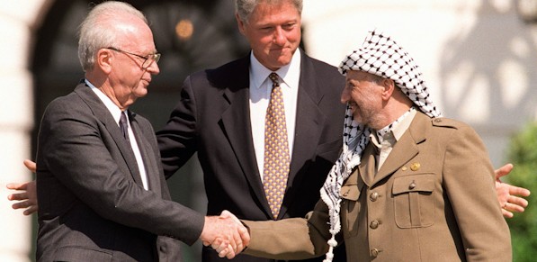 Rabin, Clinton y Arafat, tras firmar los Acuerdos de Oslo.El principal problema reside en que
