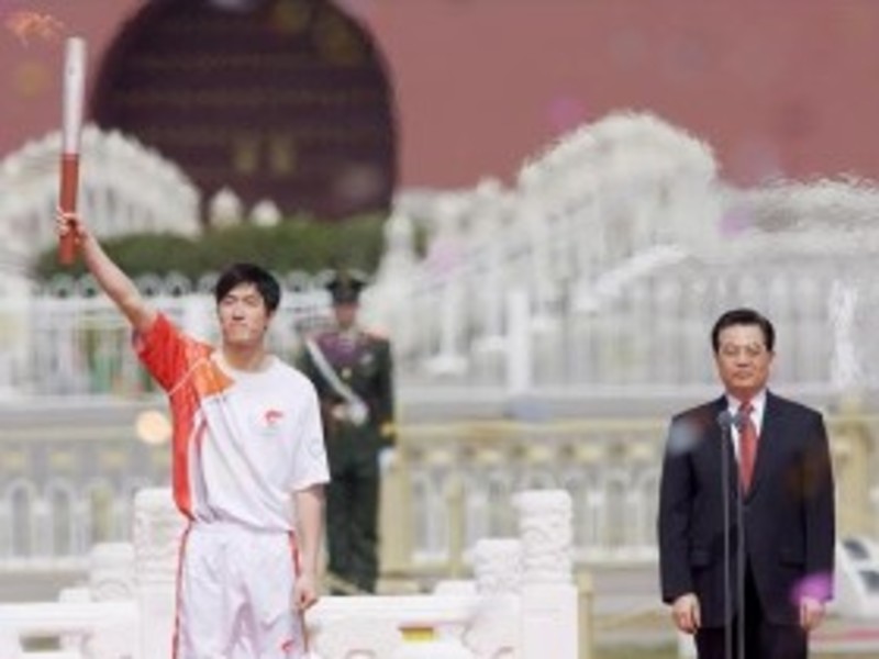 A continuación, Hu Jintao pasó la antorcha olímpica al atleta chino Liu Xiang, plusmarquista mundial de 110 metros vallas y campeón olímpico, con lo que comenzó oficialmente los relevos que llevarán la llama a un periplo de varios meses por todo el mundo.