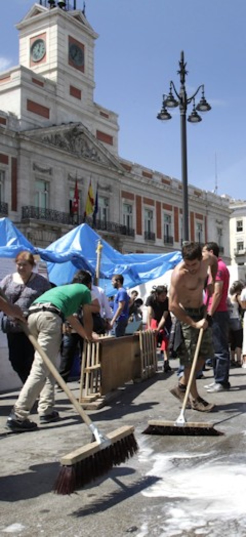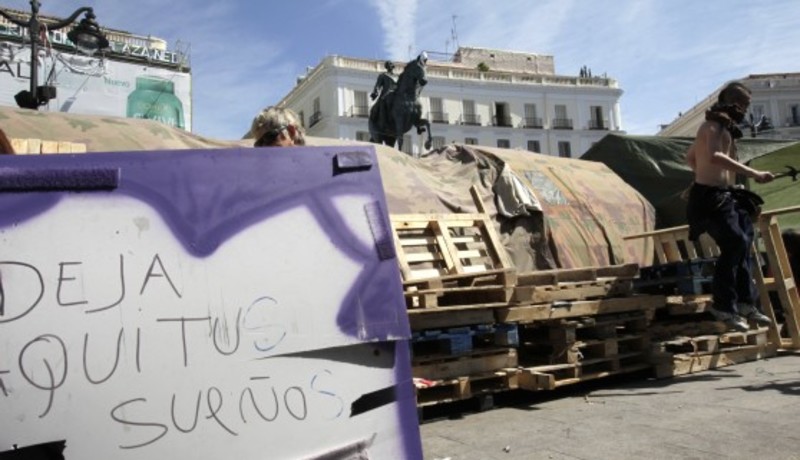 El movimiento de protesta que permanece acampado en la Puerta de Sol tras la manifestación del pasado 15 de mayo convocada por 'Democracia Real Ya' ultima sus últimas horas en el kilómetro cero después de cuatro semanas instalado con tiendas de campaña en la céntrica plaza madrileña.