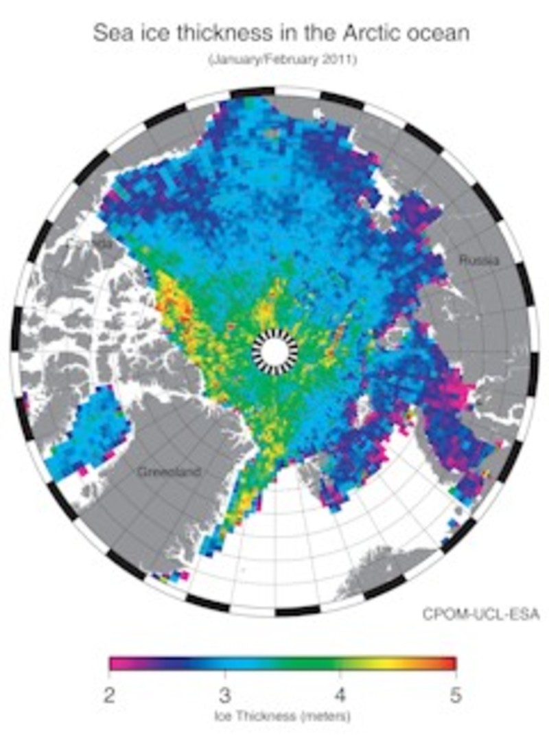 CryoSat mide la altura de la capa de hielo por encima de la línea de agua para calcular el espesor. Las medidas utilizadas para generar este primer mapa del Ártico fueron tomadas a partir de enero y febrero de 2011, cuando el hielo se acerca a su máximo anual.