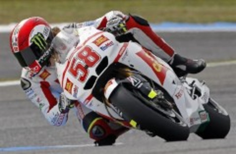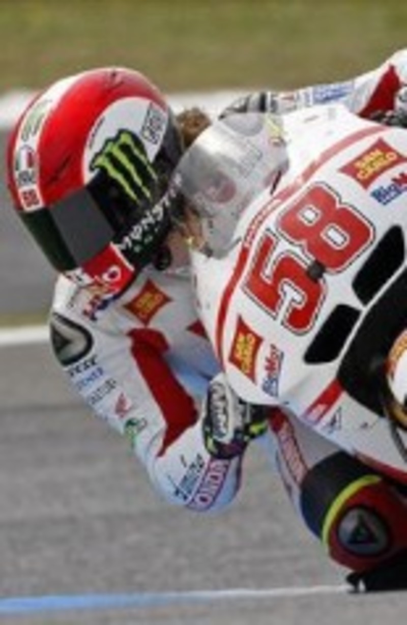 Con la pista ya seca tras la humedad que sufrieron los pilotos de 125cc, la parrilla de la categoría reina pudo rodar en plenitud de condiciones y fue Spies el que tomó el mando. El norteamericano mandó durante la mayor parte de la sesión, pero Simoncelli, con un tiempo de 1:34.718, le superó por apenas nueve milésimas y selló la segunda 'pole' de su carrera en MotoGP.