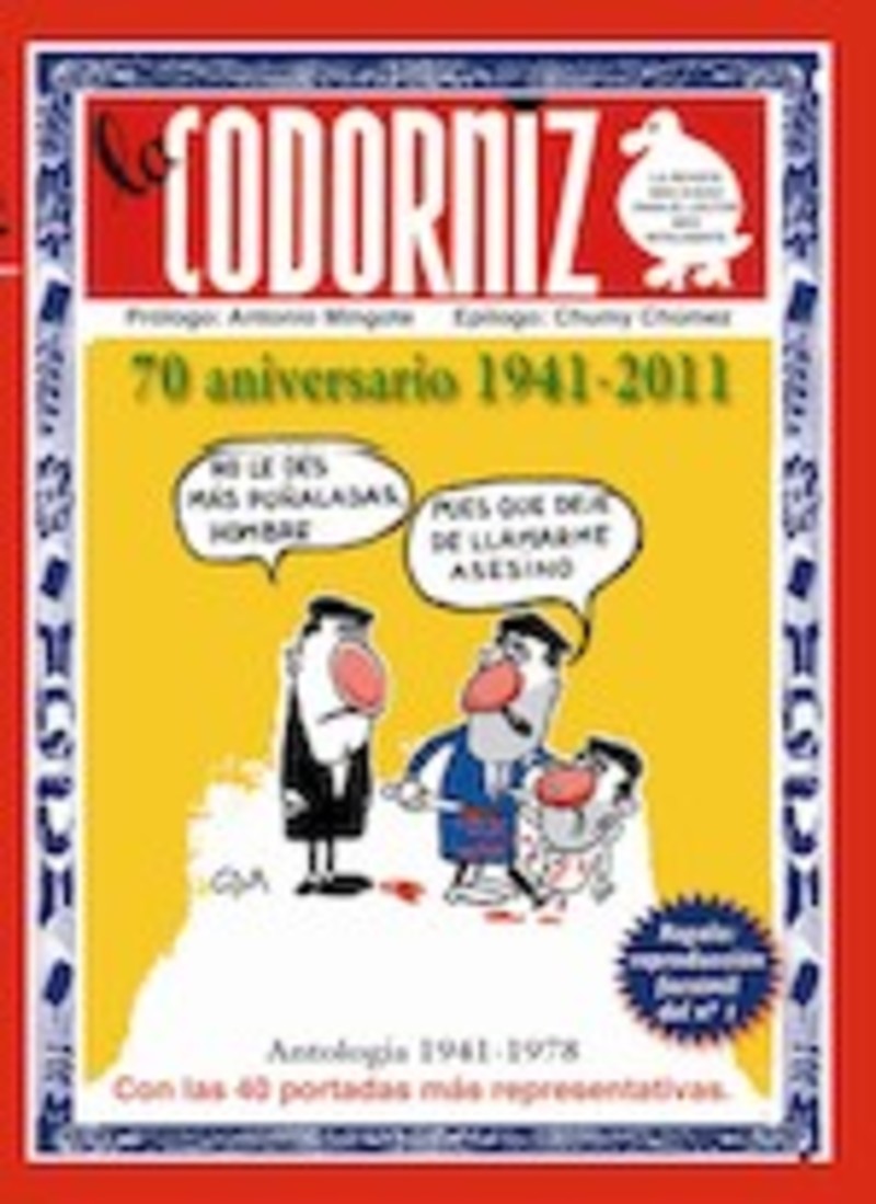 Con motivo del 70 aniversario del nacimiento de la revista se ha publicado una interesante –y, cómo no, divertidísima– antología con material gráfico y literario del popular semanario. La selección, edición y el estudio de Melquíades Prieto y Julián Moreiro permite asistir a la evolución del humor en el semanario desde sus orígenes hasta su cierre. Comprobamos en el recorrido que la que hoy nos parece una revista fundamental de denuncia de un periodo, sin embargo nació y permaneció durante mucho tiempo como una revista que entendía el humor a modo de divertimento y constituía una forma de pasar el tiempo, “una pluma de perdiz que se pone uno en el sombrero”, en palabras de Mihura. Prologado por el genial Antonio Mingote, cuyos orígenes se hallan estrechamente vinculados a La Codorniz, y con epílogo de Chumy Chúmez, perteneciente también a la escuela codornicesca, el volumen conmemorativo del 70 aniversario de La Codorniz nos acerca, en definitiva, a los orígenes del humor reciente en la prensa española.