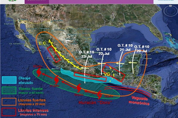 Los vientos de "Dora" con intensidad de tormenta se extienden a 240 kilómetros a la redonda desde su centro. El sistema genera oleaje elevado en las costas de Guerrero, Michoacán, Colima y Jalisco, por lo que se recomienda tomar precauciones a las embarcaciones, dijo el SMN.