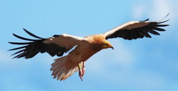 El buitre egipcio ("alimoche", en castellano y "aufrany", en catalán) es de color blanco y mucho más pequeño que otros buitres. Conocido también como "pollo faraón", esta especie carroñera destaca cuando vuela por sus alas de color blanco y negro, una cabeza pequeña y la cola en forma de cuña.