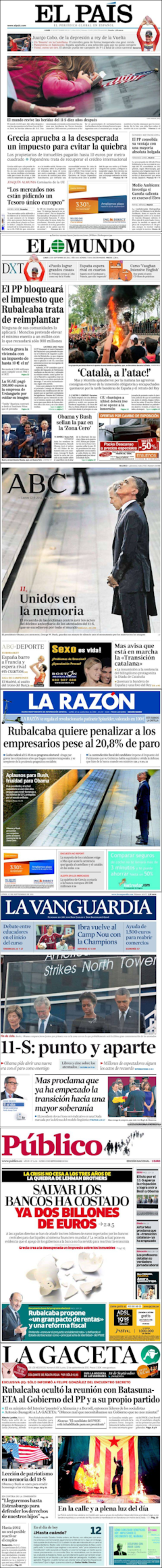 El País abre con una fotografía en la ‘zona cero’. Llanto sobre los nombres de los fallecidos aquel día en una de las dos grandes fuentes construidas en el perímetro de las Torres Gemelas. Además, ‘Grecia aprueba a la desesperada un impuesto para evitar la quiebra’ y entrevista a Joaquín Almunia, quien afirma que “los mercados están pidiendo un Tesoro único europeo”.