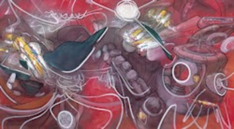 atención del espectador los motivos representados por Matta en la superficie de las pinturas expuestas, entre las que se intuyen figuras antropomorfas, una silla, lo que se asemeja a una bomba de oxígeno, palancas que parecen accionar algo y piezas de maquinaria, entre otros elementos que no hacen sino invitar a reflexionar sobre lo que contiene esta instalación y su significado.