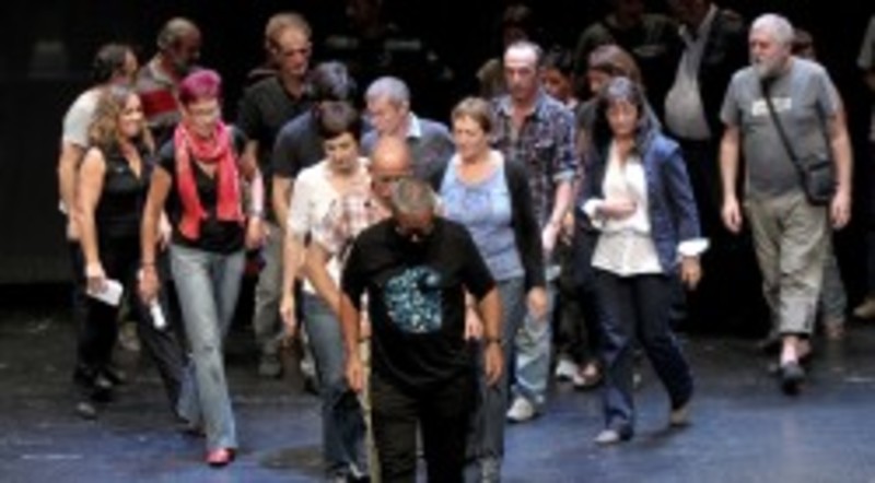 Los presos de ETA han escenificado su adhesión al acuerdo de Guernica en un acto celebrado al mediodía de hoy en un teatro de la villa foral vizcaína, en el que han tomado parte 26 antiguos internos de la organización terrorista.