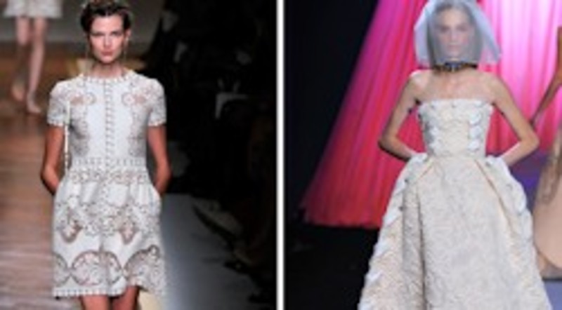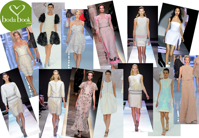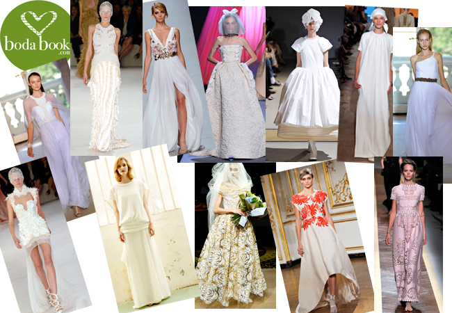 novia. Para las que se casen por la Iglesia y quieran un vestido largo pero están un poco perdidas y no saben por dónde empezar, esta selección puede servir de inspiración... De arriba a abajo y de derecha a izquierda: cogido al cuello con capa de gasa de Andrew Gn, con falda de pequeños volantes de Alexander McQueen, con flores en el pecho y cinturón dorado de Emanuel Ungaro, con brocados y mucho volumen de Viktor & Rolf, más volumen pero hasta la rodilla de Comme des Garçons, tipo túnica de Hermés, con escote asimétrico y falda de gasa de Andrew Gn, con plumas y más corto por delante que por detrás de Alexander McQueen, recto con corte a la cadera de Greiss, de encaje y mucho volumen de Vivienne Westwood, con cuerpo de flores en color coral de Maiyet y rosa palo de manga corta de Valentino.