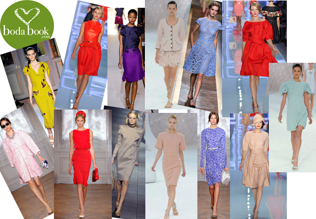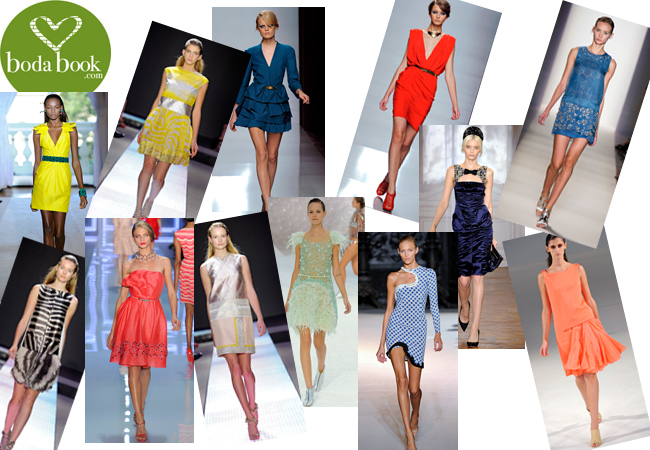invitadas a una boda. ¿Os apetece llevar un traje corto? ¿De qué color? Aquí tenéis para elegir... De arriba a abajo y de derecha a izquierda: vestido amarillo chillón con escote en V y detalle en los hombros de Andrew Gn, amarillo y plata de Giambattista Valli, azulón con manga larga y falda de varias capas de Emanuel Ungaro, rojo pasión con gran escote también de Emanuel Ungaro, de gasa azul con pedrería de Vanessa Bruno, con print de cebra y falda de flecos de Giambattista Valli, de organza rojo con volante en el escote de Dior, recto sin mangas y metalizado de Giambattista Valli, verde pálido con plumas y cinturón de perlas de Chanel, vestido asimétrico, muy geométrico y sexy, de Stella McCartney, azul petróleo drapeado con lazo negro en el escote de Nina Ricci y naranja con volante a la cadera de Hussein Chalayan.