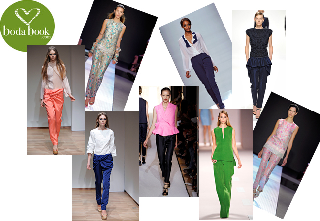 look impecable, ¿sabéis como? Mirad... De arriba a abajo y de derecha a izquierda: Pantalón naranja drapeado en la cintura de Anne Valérie Hash, mono de flores metalizado de Giambattista Valli, pantalón recto de crêpe azul petróleo de Emanuel Ungaro, pantalón azul oscuro con volante en la cintura de Dries Van Noten, azul metálico drapeado en la cintura de Anne Valérie Hash, negro de seda de Yves Saint Laurent, conjunto verde ácido de Akris y conjunto metalizado de flores rosas de Giambattista Valli. La mayoría de estos looks vienen con blusa blanca o beige, pero es mejor que a una boda llevemos otro color, por respeto a la novia. Así como el pantalón negro, preferiblemente que sea de otro color.
