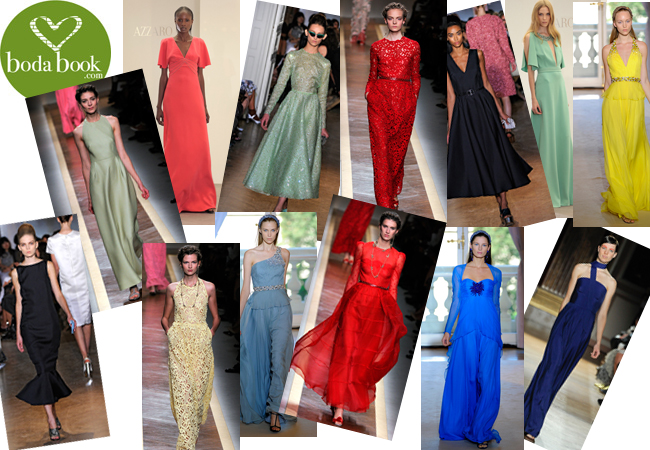 ¿Y si las madrinas, o madres de las novias, quieren vestir de largo? Pocas ocasiones tenemos para ponernos un vestido de este tipo, así que en una ocasión tan especial como la boda de un hijo, tenemos que elegir muy bien nuestro look. Con algo parecido a estos vestidos seguro que acertáis. De arriba a abajo y de derecha a izquierda: vestido sin manga en verde agua de Valentino, con manga al codo y en color coral de Azzaro, verde con paillettes hasta el tobillo, muy años 50', de Rochas, de encaje de algodón rojo con manga larga de Valentino, negro, color prohibido, (pero para fijarnos en la forma que es ideal), de Rochas, verde con escote en V de Azzaro, amarillo chillón con pedrería en tirantes y cinturón de Andrew Gn, negro, también prohibido, pero es tan estiloso, ¿verdad?... Si nos lo imaginamos en rojo o en verde, ¡perfecto! Éste es de Rochas. Amarillo de encaje de algodón con bolsillos de Valentino, azul cielo con escote asimétrico y pedrería de Andrew Gn, rojo vaporoso de manga larga de Valentino, azul eléctrico de Andrew Gn y azul petróleo de Martin Grant.