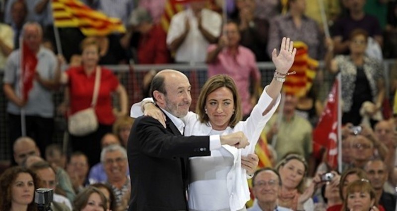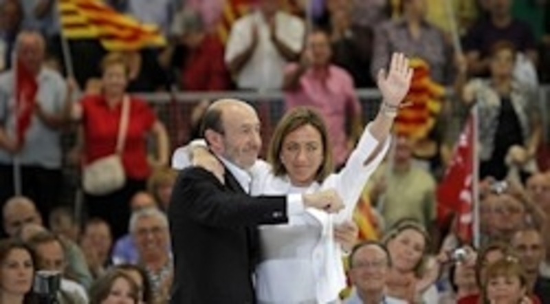 Rubalcaba y Chacón se abrazan en Barcelona y cargan contra Rajoy
