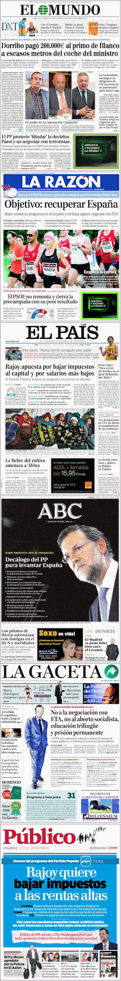 Las principales líneas del programa electoral que el PP adelantó este domingo son portada en todos los diarios de este lunes, que destacan aspectos diferentes. Así, mientras El Mundo destaca que “El PP promete blindar la doctrina Parot y no negociar con terroristas”, El País se queda con que “Rajoy apuesta por bajar los impuestos al capital y por salarios más bajos”, casi igual que Público: “Rajoy quiere bajar impuestos a las rentas altas”. Del mismo modo, La Razón, a cinco, escribe “Objetivo: recuperar España” y destaca que Rajoy centra su programa en el empleo y rechaza tajante negociar con ETA. ABC presenta el “Decálogo del PP para levantar España”. Más cosas, agreden a Willy Meyer, las amenazas de los pilotos de Iberia de huelga estas Navidades y más datos sobre el caso Campeón: “Dorribo pagó 200.000 euros al primo de Blanco a escasos metros del coche del ministro”.