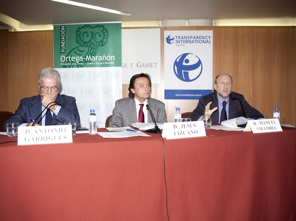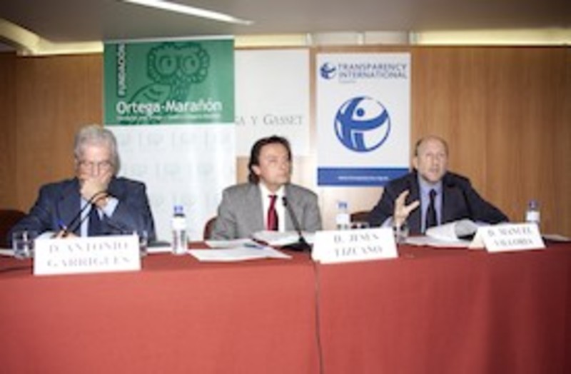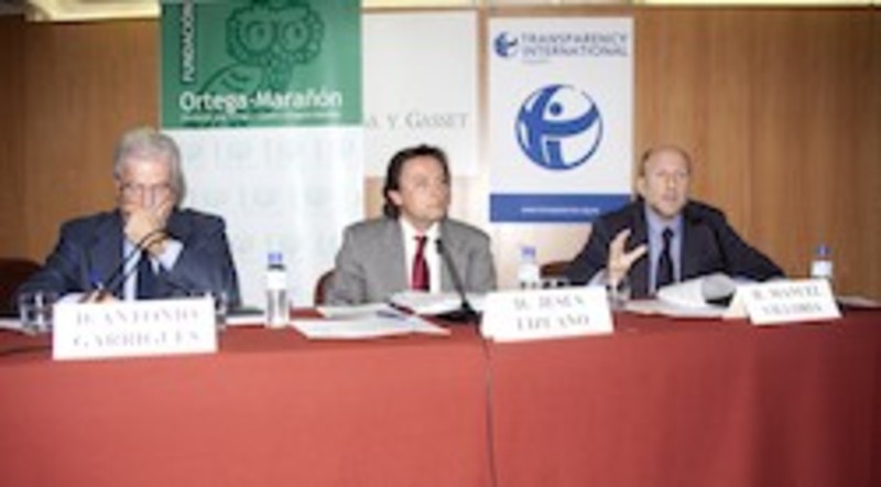 'Índice de fuentes de soborno 2011', su último estudio sobre corrupción, en la Fundación Ortega-Marañón. El estudio recoge, de forma geográfica y sectorial, un listado sobre la propensión que tienen las empresas de los principales países del mundo a pagar sobornos en el extranjero. Los encargados de exponer los resultados han sido Jesús Lizcano, presidente de Transparencia Internacional España, Antonio Garrigues, patrono vitalicio de la Fundación Ortega-Marañón, y Manuel Villoria, catedrático de Ciencia Política y responsable de la investigación.
