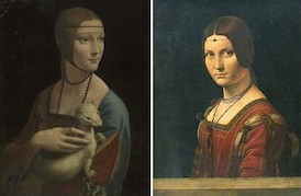 diferentes direcciones. Un gesto que comparte incluso el armiño que sostiene en su regazo, cuya presencia en el lienzo ha sido explicada por el hecho de que este animal simbolizaba la pureza y la limpieza ya que, según la tradición de la época, rehuía la suciedad y comía sólo una vez al día.