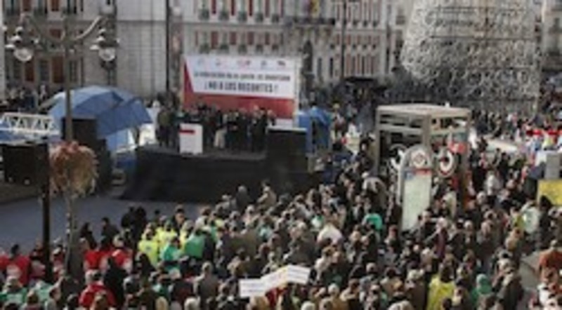Al inicio de la manifestación uno de los gritos que más se han escuchado ha sido el de 'Aguirre dimisión', que coreaban centenares de asistentes con pancartas con la imagen de la presidenta de distinta forma: con nariz de Pinocho, con dinero en los ojos, o junto al presidente de los empresarios, Arturo Fernández.