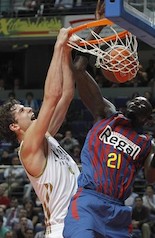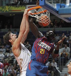 Poco a poco, el Madrid fue ganando en consistencia y a la rapidez de su juego y la mayor movilidad de sus hombres se añadió la superioridad en el rebote. Carroll empezó a dañar a la defensa catalana y tras un primera ventaja significativa (37-30) después de una canasta muy protestada por el banquillo barcelonista, en el minuto 17, el Barça reaccionó por medio de Ndong (37-34) y, beneficiado por una antideportiva de Sergio Rodríguez, equilibró el marcador.