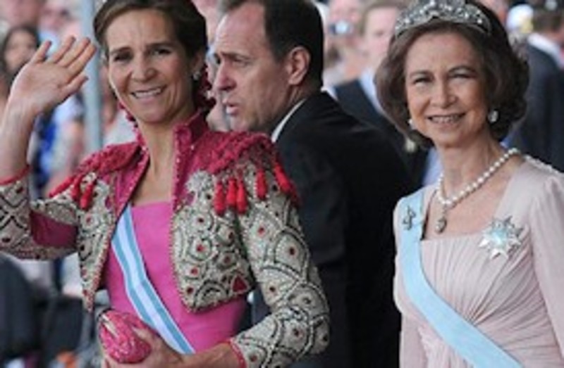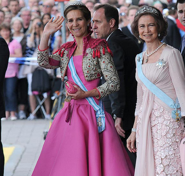 La Infanta Elena eligió para la misma boda un original vestido de Lorenzo Caprile de clara inspiración goyesca. ¡Muy español!