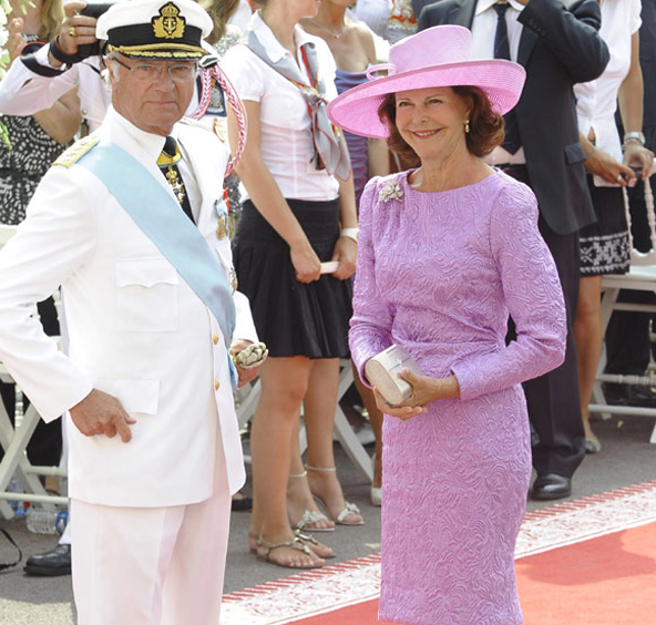 Silvia de Suecia iba más que perfecta con este vestido malva con brocados a la boda monegasca.