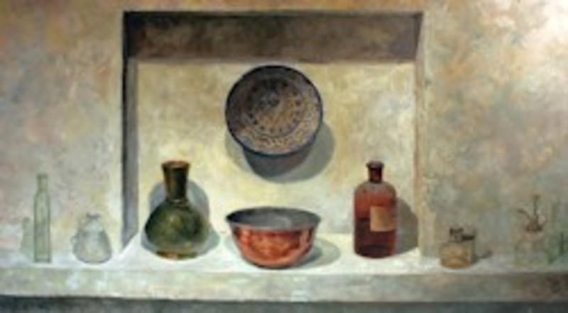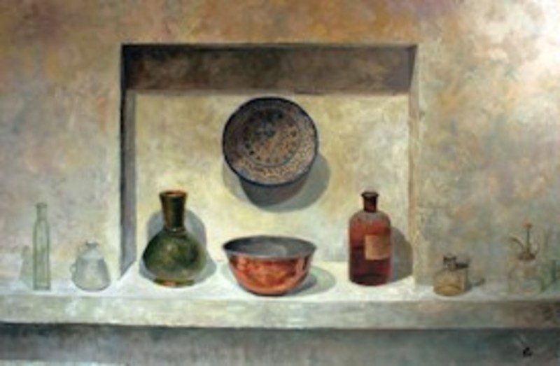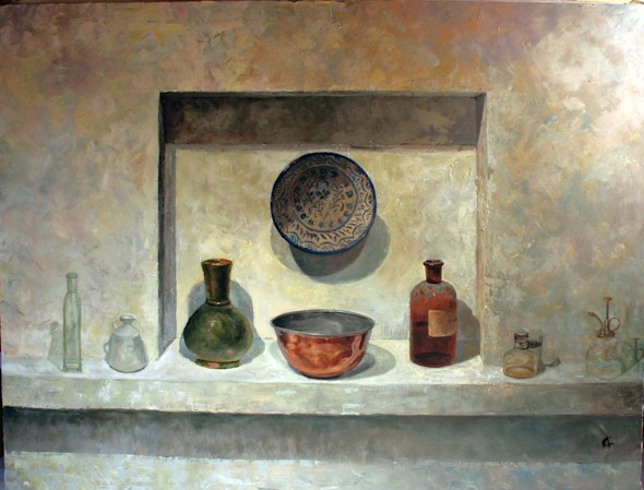 Recipientes y plato colgado (144 x 112 cm), óleo de Ángel Alcázar. Precio: 3.600 euros.